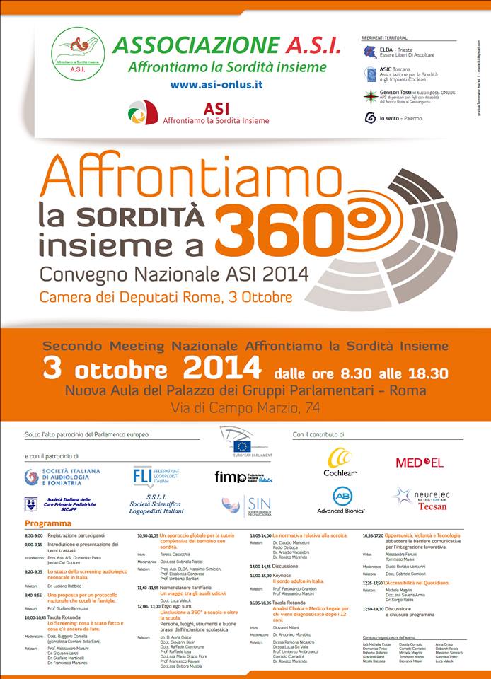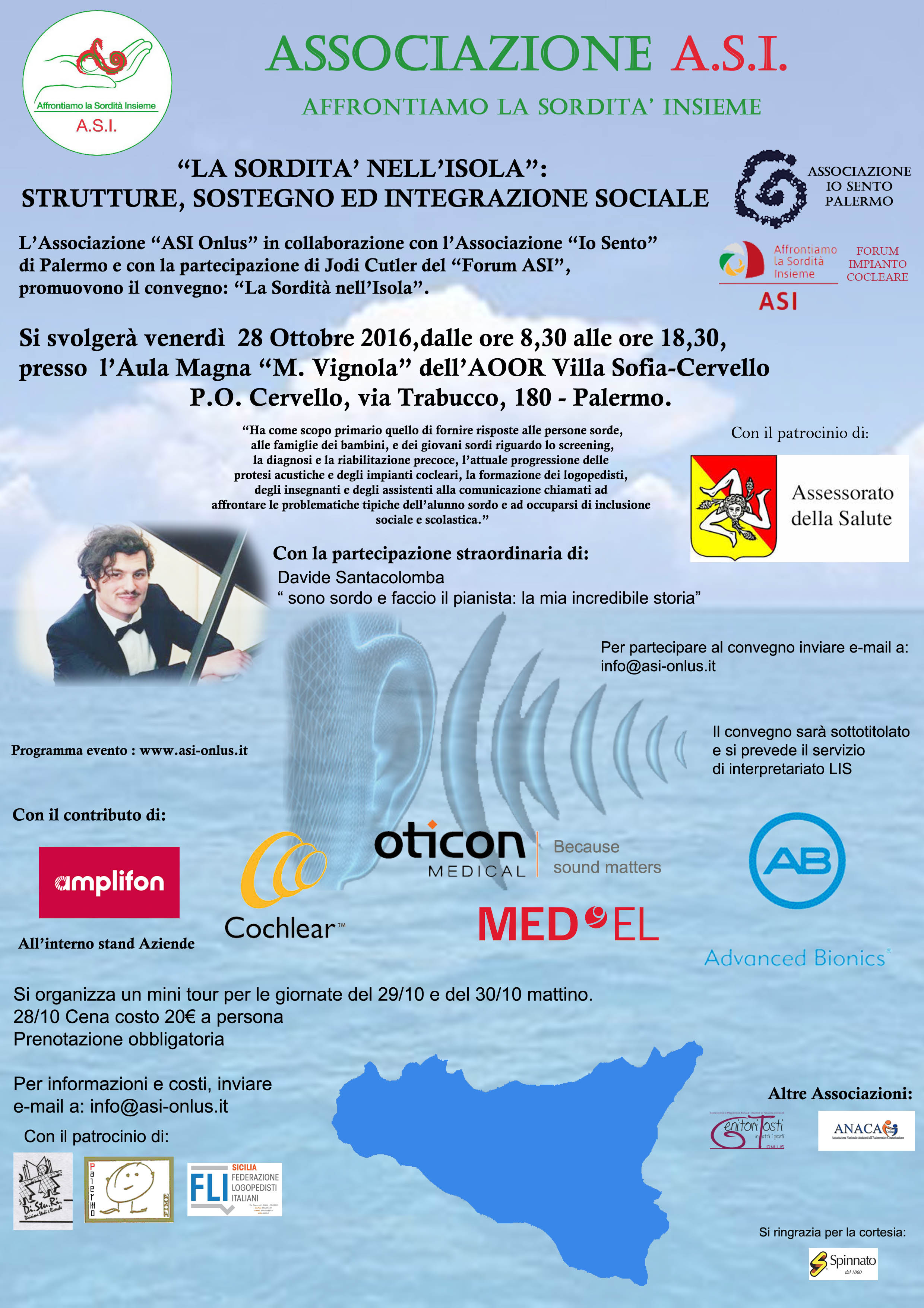 L’Associazione "ASI" in collaborazione con l’Associazione" Io Sento" di Palermo e con la partecipazione di Jodi Cutler del "Forum ASI", promuovono il convegno “La Sordità nell’Isola”, si svolgerà Venerdì 28 Ottobre 2016, dalle ore 8,30 alle ore 18,30 presso l’Aula Magna “M. Vignola” dell’AOOR Villa Sofia - Cervello